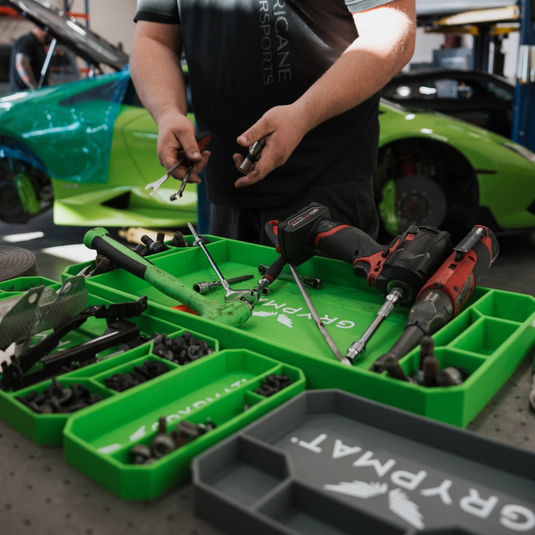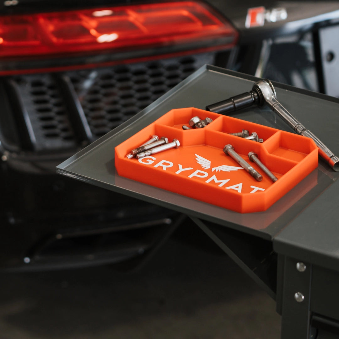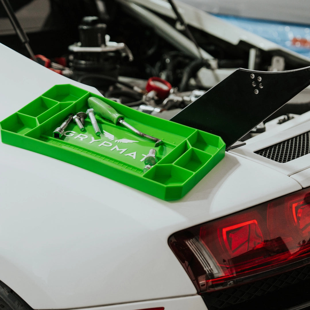 Our flexible, non-slip Grypmats give every tool and part a dedicated home base—no rolling, no slipping, no paint damage, and no lost hardware. Lay them across fenders, wings, dashboards, carts, benches, or tight spaces and they stay locked in. Heat-resistant, surface-safe, and built to flex anywhere you work… all without magnets.