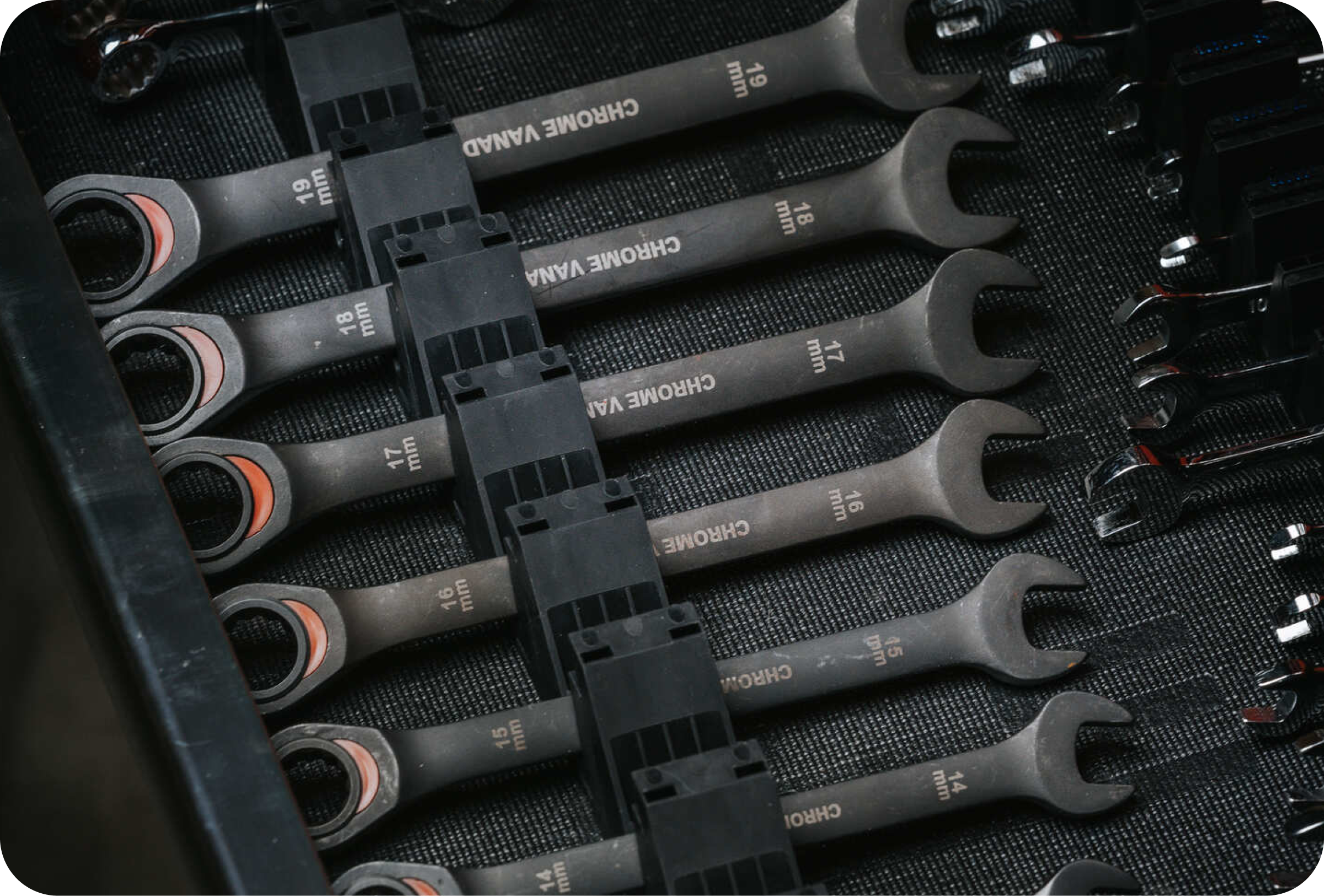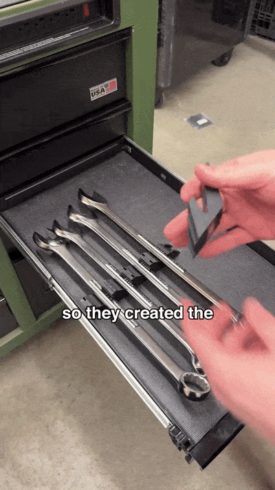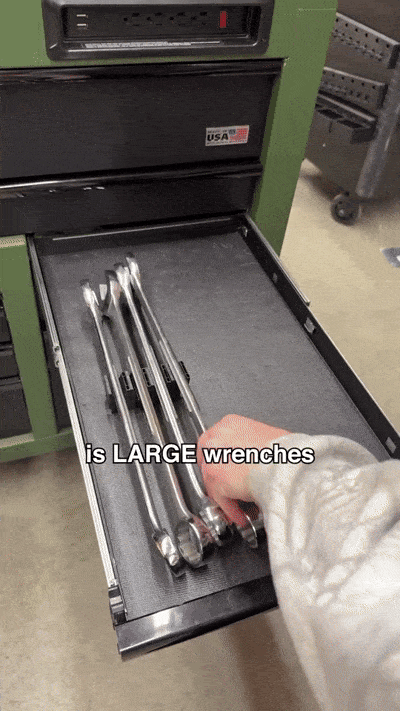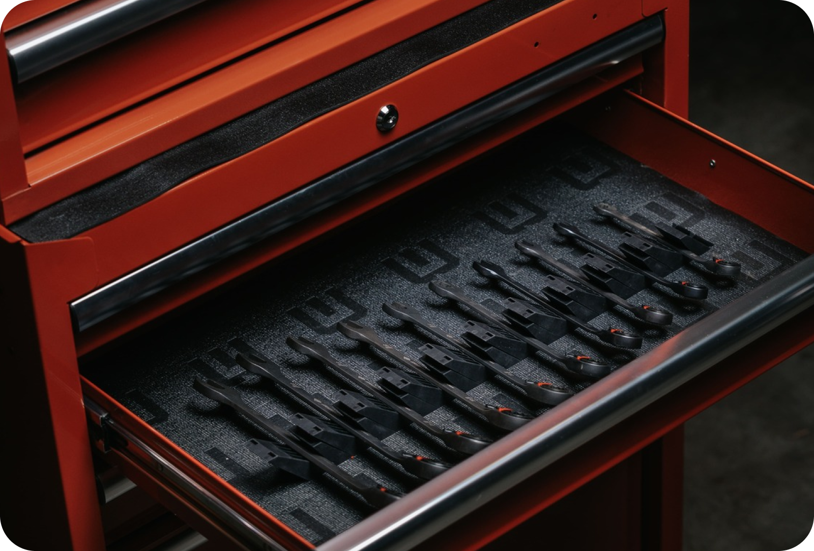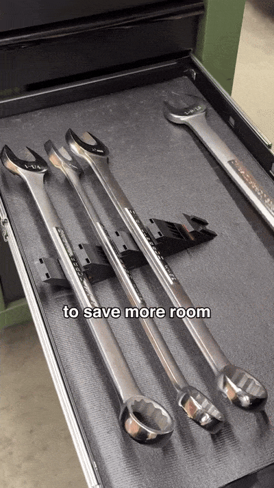Built specifically for 1”–2” jumbo wrenches, this angled organizer holds each wrench at a 45-degree tilt so it sits lower and stays secure. The result is faster grab-and-go access, cleaner spacing, and a layout that looks professional in any drawer.