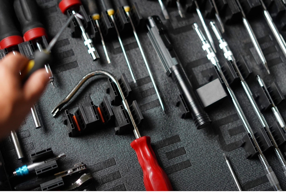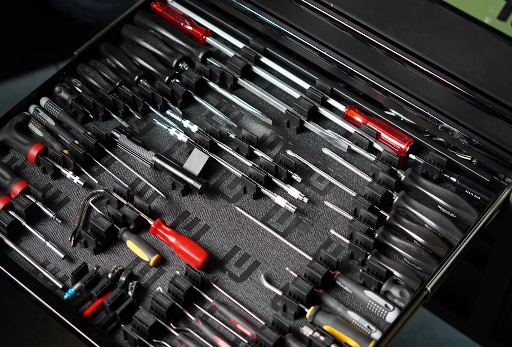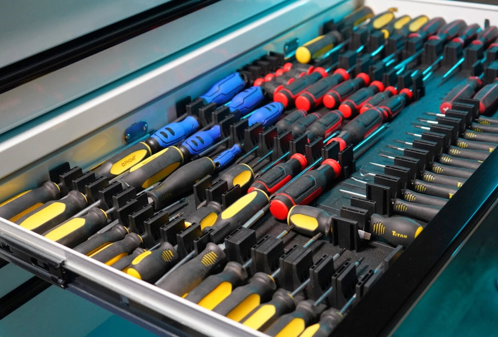 Our flexible rubber organizers snap together to match any screwdriver set—Phillips, flathead, Torx, square, or hex. No cheap plastic, no rigid trays, no wasted space—just a clean, custom layout that fits your drawer perfectly.